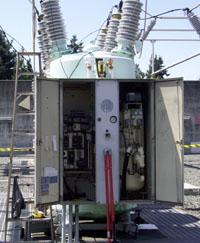 Today, the local substation is having problems with one of the big transformers. Fortunately, there are three transformers for every circuit (if you look carefully, you can see the three sets of wires atop the transformers at right) so that they can deal with problems without turning the power off! (Turning the power off would result in blackouts.) At right you can see that they've opened the case containing the faulty transformer. The transformer itself was taken out of the side of the case.