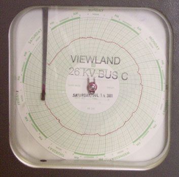 Electricity usage is measured with rotating charts like the one at right. The chart is a week long; every week it gets replaced by a substation worker. If you look closely, you can see the slight differences in energy use during the day and during the night.
